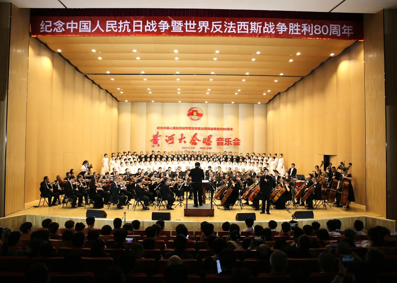 23日下午,由山西中华文化促进会、山西省延安精神研究会、山西省归国华侨联合会、山西省台湾同胞联谊会和我校共同主办,由校党委宣传部、艺术学院、校红色文化和国防教育研究中心共同承办,山西时光漫步交响乐团附属合唱团、山西时光漫步交响乐团和学校交响乐团联合演出的《黄河大合唱》音乐会在科艺苑唱响。省政协原副主席、山西中华文化促进会主席姜新文,省人大常委会原副主任、山西省延安精神研究会会长岳普煜,山西省侨联党组书记、主席王进仁,山西省台联党组书记鹿妙红,山西省演出行业协会会长陈燕萍,《黄河大合唱》词作者光未然的儿子张安东先生和内侄黄平先生,校党委书记张晓永、党委副书记赵文军出席。
